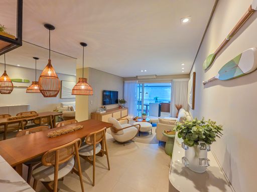 - 3 dormitórios, sendo 2 suítes - Suíte principal com terraço privativo - Living amplo com dois ambientes - Cozinha estilo americana, com bancada em pedra e armários planejados - Banheiro social - Varanda ampla com churrasqueira elétrica - Todos os ambientes com ar-condicionado - Área de serviço com ventilação natural, máquina lava e seca e freezer - 1 vaga de garagem rotativa Diferenciais e Lazer do Condomínio: Piscina adulto Piscina infantil Salão de Jogos e TV Salão de Festas Playground Sauna Área Verde/Jardim Sanitários Portaria Serviço de praia. À Disponibilidade e Valores dos Imóveis anunciados podem sofrer alterações a qualquer momento, sem aviso prévio.