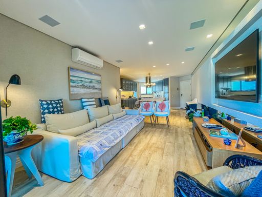 - 3 dormitórios, sendo 2 suítes - Living com dois ambientes - Cozinha americana, equipada - Banheiro social - Varanda com churrasqueira, e fechamento em vidros - Área de serviço - Ambientes climatizados Diferenciais e Lazer do Condomínio. Piscina Adulto Piscina infantil Salão de Festas Churrasqueira Sauna Área Verde/Jardim Sanitários Portaria Serviço de praia À Disponibilidade e Valores dos Imóveis anunciados podem sofrer alterações a qualquer momento, sem aviso prévio.