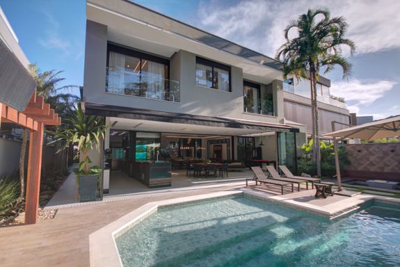 - 600 m² de área construída - 2 pavimentos - Living amplo com pé-direito duplo - 7 suítes, sendo 1 master com closet e jacuzzi - Todos os ambientes com ar-condicionado e móveis planejados - Sala de estar e sala de jantar para 12 pessoas - Cozinha completa equipada - Suíte de hóspedes e dependência de funcionários - Espaço gourmet com churrasqueira em inox, chopeira tipo naja, cervejeiras e ice maker - Mesa gourmet para 10 pessoas - Piscina aquecida com prainha, spa e iluminação em LED - Sauna úmida integrada à piscina - Área fogo (fire place) - Telão externo de alta definição - Adega climatizada - Som ambiente e Wi-Fi - Energia fotovoltaica e aquecimento a gás Condomínio: - Segurança e guarita com controle de acesso - Serviço de praia com guarda-sol e barracas - Transporte para praia com carrinhos de golf - Clube com quadra de tênis e academia de alto padrão À Disponibilidade e Valores dos Imóveis anunciados podem sofrer alterações a qualquer momento, sem aviso prévio.