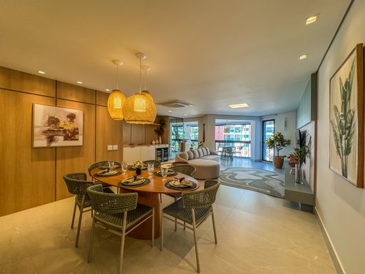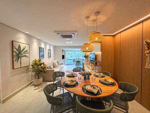 - 4 dormitórios, sendo 3 suítes - Sala de estar - Sala de jantar - Cozinha americana - Banheiro social - Área de serviço - Varanda gourmet equipada com churrasqueira e envidraçada - Ambientes climatizados - 2 Vagas de garagem Diferenciais e Lazer do Condomínio: Piscina adulto Piscina infantil Quadra de tênis Salão de festas Salão de jogos Sauna seca Área verde Maquina de gelo Serviços de praia. À Disponibilidade e Valores dos Imóveis anunciados podem sofrer alterações a qualquer momento, sem aviso prévio
