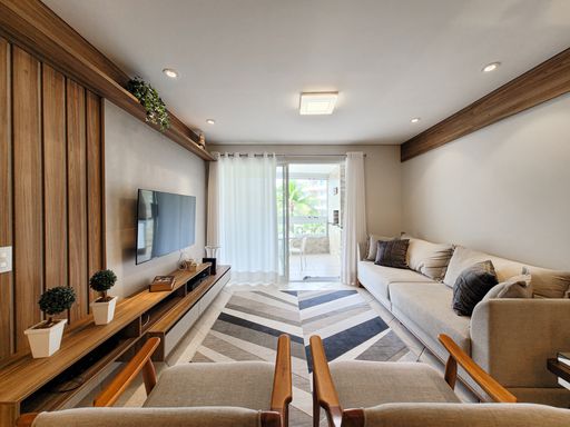- 2 suítes - Living com dois ambientes - Cozinha americana - Lavabo - Espaço gourmet com churrasqueira e fechamento em vidros - Área de serviço - Ambientes climatizados Diferenciais e Lazer do Condomínio: Clube compartilhado com Restaurante café, (2 Quadra de Tênis, Quadra de areia, Quadra de bocha, playground) Piscina adulto com deck Piscina coberta aquecida Piscina infantil Cinema Brinquedoteca Salão de Jogos e TV Salão de Festas 3 salões gourmets Sauna com Sala de Repouso Academia Quadra de Tênis Área Verde/Jardim Sanitários Portaria Serviço de praia. À Disponibilidade e Valores dos Imóveis anunciados podem sofrer alterações a qualquer momento, sem aviso prévio.
