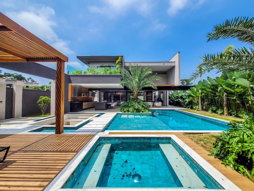- 6 suítes - 2 lavabos - 6 vagas de garagem - Cozinha e espaço gourmet totalmente equipados - Piscina aquecida com iluminação LED, prainha e spa - Sistema de automação integrado - Arquitetura moderna com linhas curvas e fluídas - Design arrojado e atual À Disponibilidade e Valores dos Imóveis anunciados podem sofrer alterações a qualquer momento, sem aviso prévio.