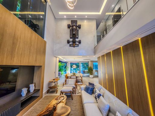 - 7 suítes, sendo uma no térreo - Todas com móveis planejados e ar-condicionado - Suíte master com banheira aquecida a gás - Sala de TV e sala de jantar integradas a área gourmet - Lavabo - Cozinha americana - Dormitório de serviço com banheiro - Lavanderia - Hall de entrada e sala de estar com pé direito duplo - Cortina automática e porta principal com fechadura eletrônica - Copa no pavimento superior com pia, micro-ondas e frigobar - Ambientes sociais climatizados - Sistema de automação para controle de ar-condicionado, som e outras funções - Garagem com 4 vagas, sendo duas cobertas e duas descobertas - Piscina aquecida - Spa integrado com hidromassagem e iluminação - Sauna úmida com parede externa em pedra natural - Solarium com espreguiçadeiras e ducha - Churrasqueira com ilha integrada à cozinha - Iluminação em LED e sistema de monitoramento - Sistema de energia solar fotovoltaica em funcionamento - Móveis planejados Todeschini em todos os ambientes - Pisos e revestimentos Portobello - Eletrodomésticos da Electrolux À Disponibilidade e Valores dos Imóveis anunciados podem sofrer alterações a qualquer momento, sem aviso prévio.