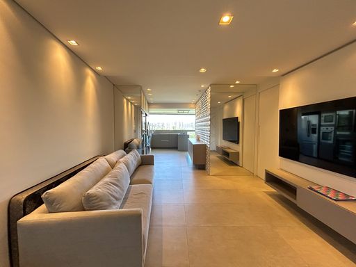 - 2 dormitórios, sendo 1 suíte - Living com dois ambientes - Cozinha conceito aberto - Banheiro social - Área de serviço - Varanda com churrasqueira - Decorado e equipado - Ambientes climatizados - Condomínio com piscina e serviço de praia