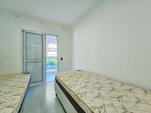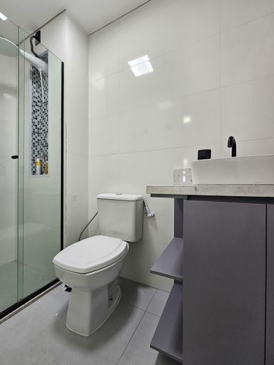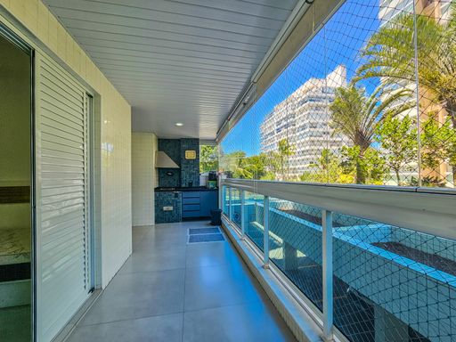- Sacada gourmet com fechamento em vidro, churrasqueira e vista para área verde do edifício, favorecendo a privacidade