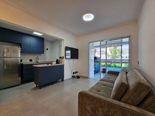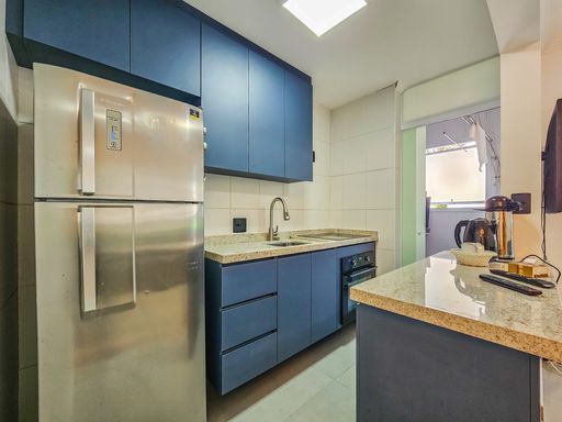 - Cozinha americana com móveis planejados e eletrodomésticos