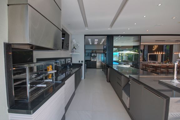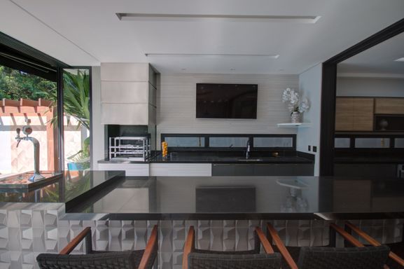 - Espaço gourmet com churrasqueira em inox, chopeira tipo naja, cervejeiras e ice maker