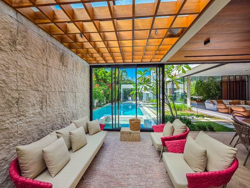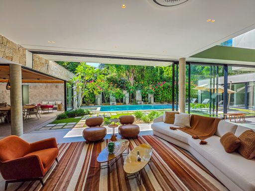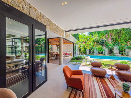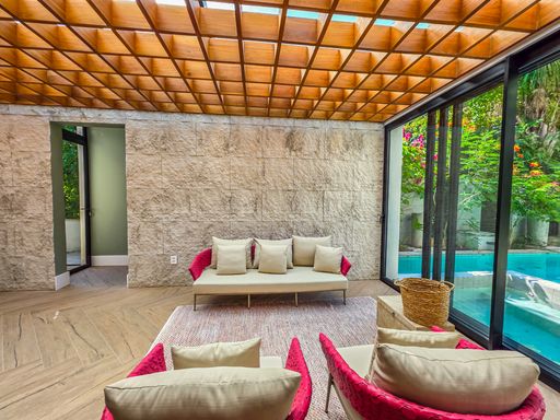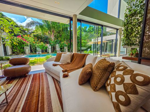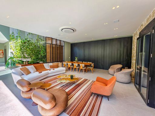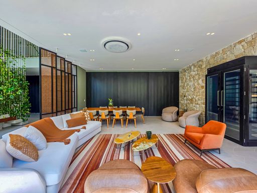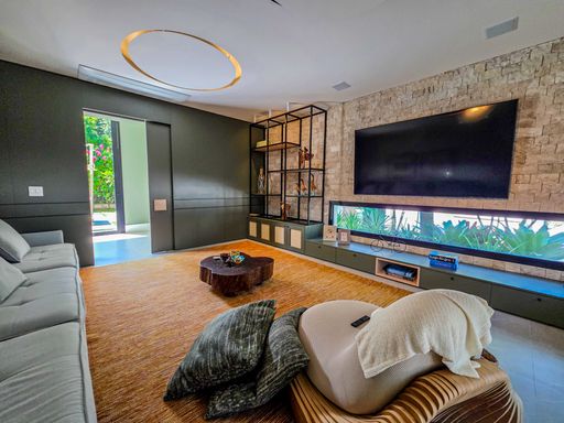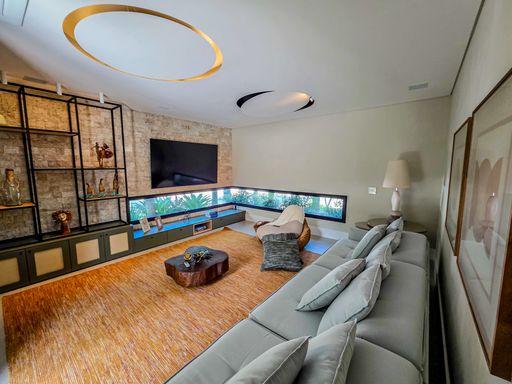 - Sala de estar com pé-direito duplo, decorada e equipada