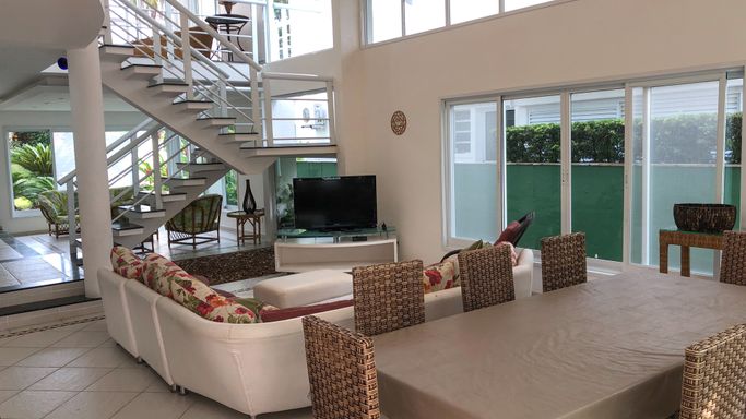 Bar Rapanui na praia e muito espaço com coqueiros, duchas de água doce, espreguiçadeiras, mesas e cadeiras com guarda-sóis para seu conforto e diversão, serviço de praia e guaritas de segurança com controle de acesso para praia x condomínio