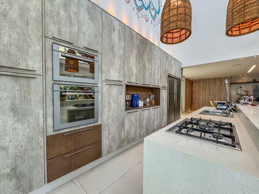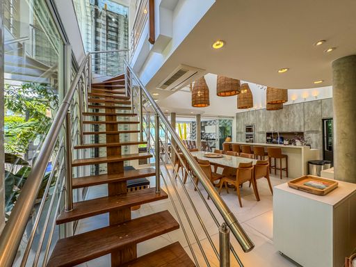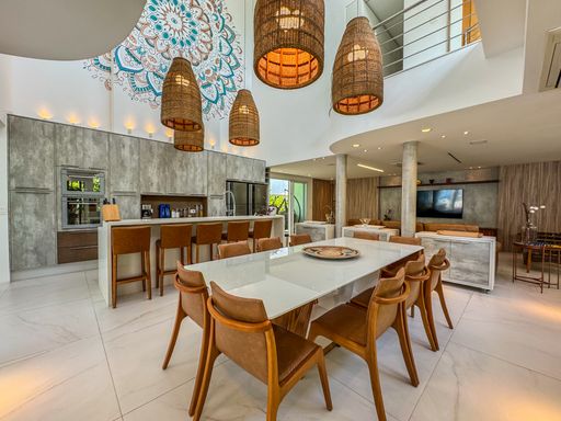 - Living integrado com três ambientes: sala de estar, sala de jantar e cozinha em conceito aberto