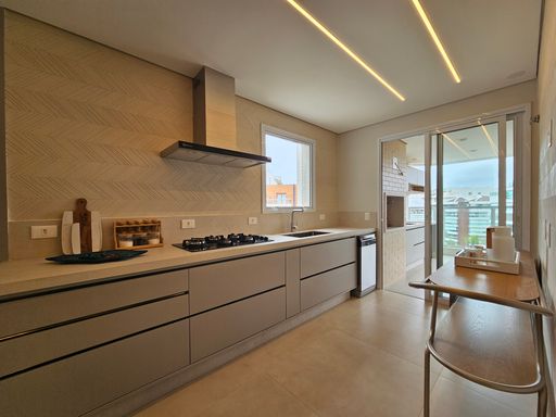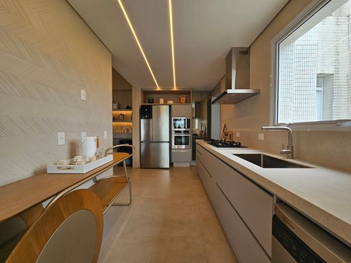 - Cozinha equipada com geladeira, micro-ondas, forno, cooktop e lava-louças Electrolux/Panasonic.